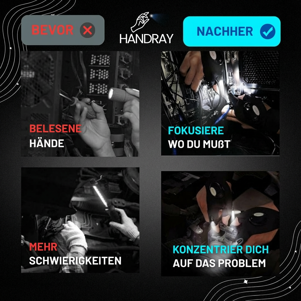 Das Problem: Eine Hand hält die Lampe, die andere versucht zu arbeiten. Stirnlampen blenden oder leuchten am falschen Punkt, enge Räume lassen kaum Platz für zusätzliches Licht. Eigentlich brauchen Sie Licht direkt am Finger.