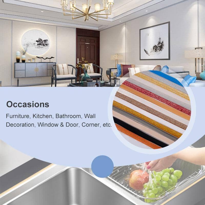 Selbstklebende Zierleisten gut auf jeder glatten sauberen Oberfläche über alten Fliesen, wie Keramik, Glas, Metall, glatte gestrichene Wand, oder lackiertes Holz; wasserdichte Zierleisten sind für eine Lücke von allen Fliesen verwendet.